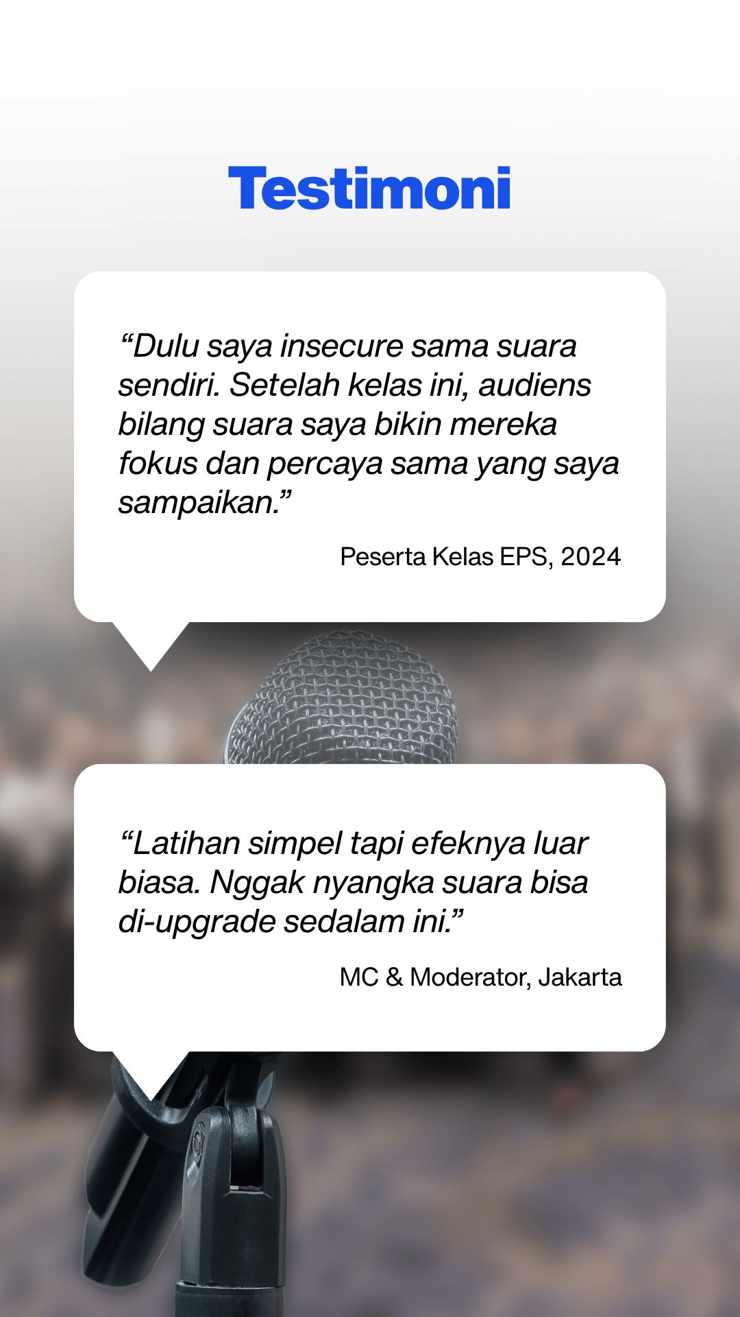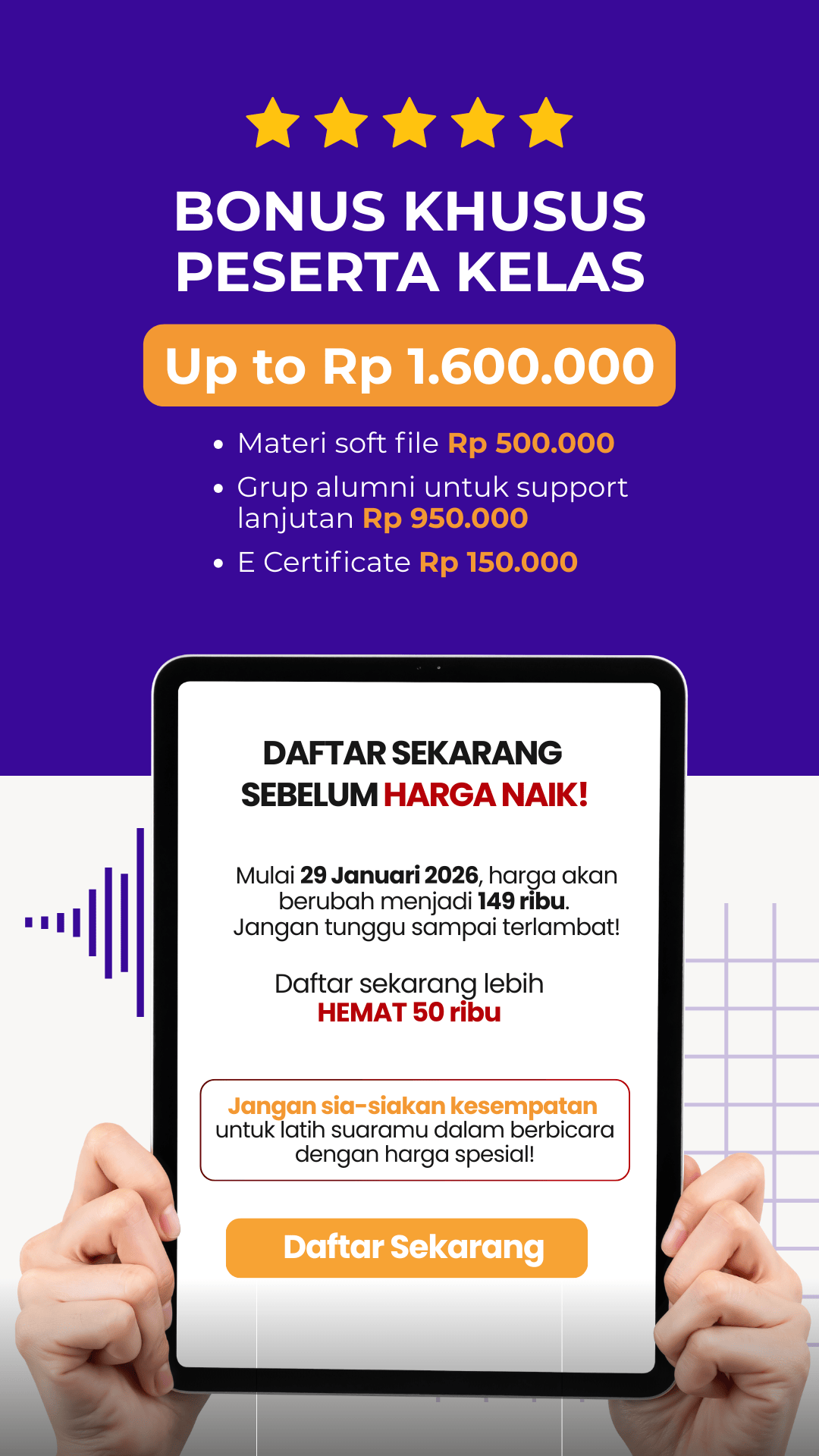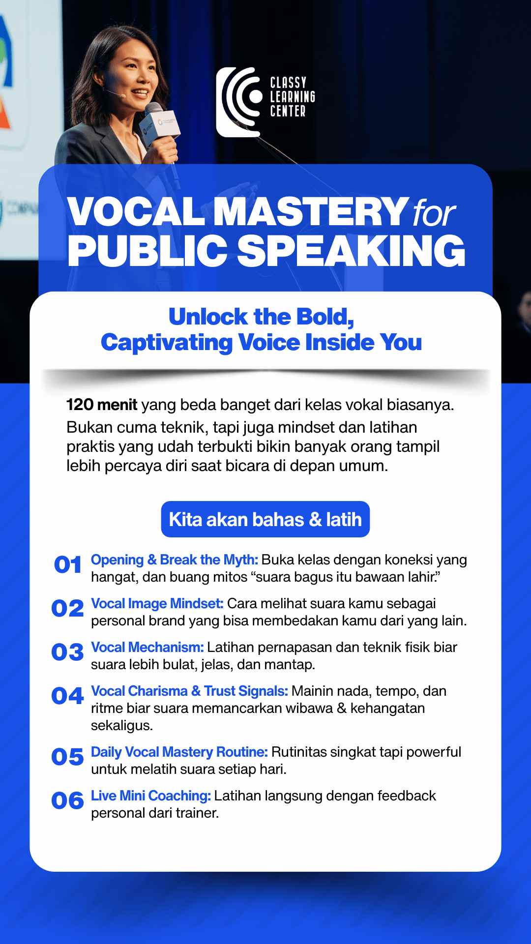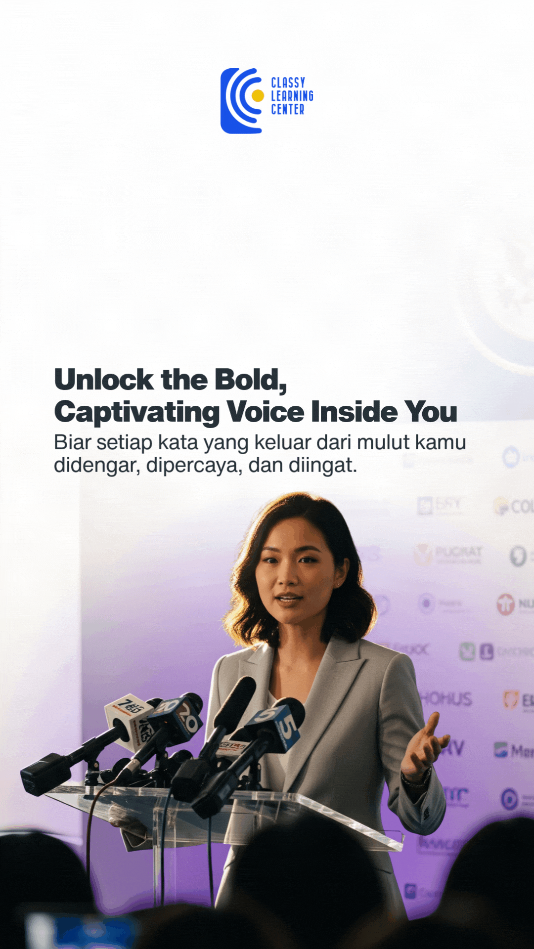 Kamu akan belajar bukan cuma bicara. Tapi berbicara dengan impact. Karena saat kamu menguasai suara, kamu menguasai perhatian!